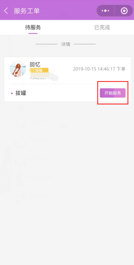 技师登录小助手,服务工单--待服务会显示刚刚保存的那一条订单,点击开始服务