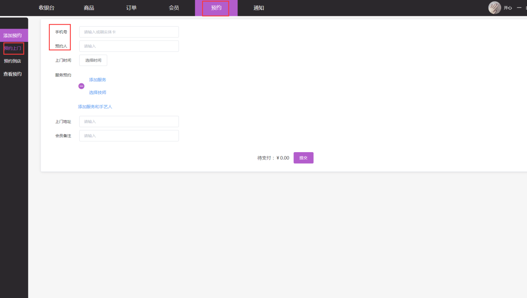 2、点击预约--添加预约--预约上门--输入手机号,姓名