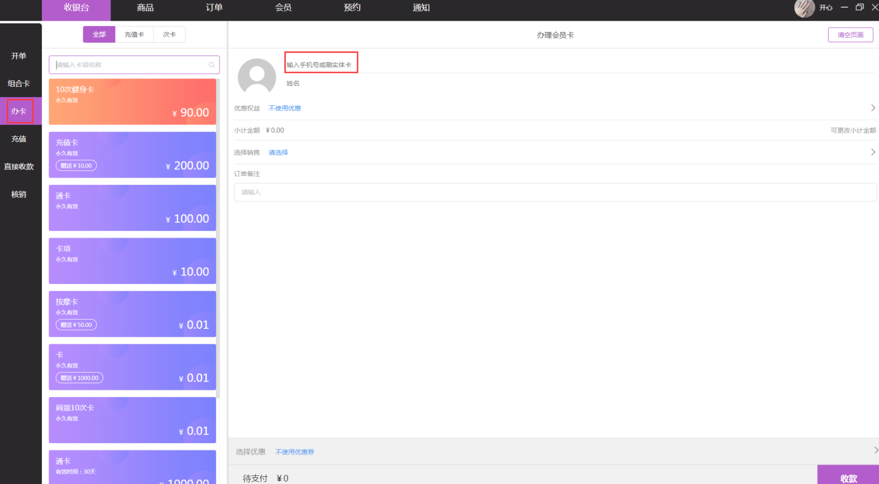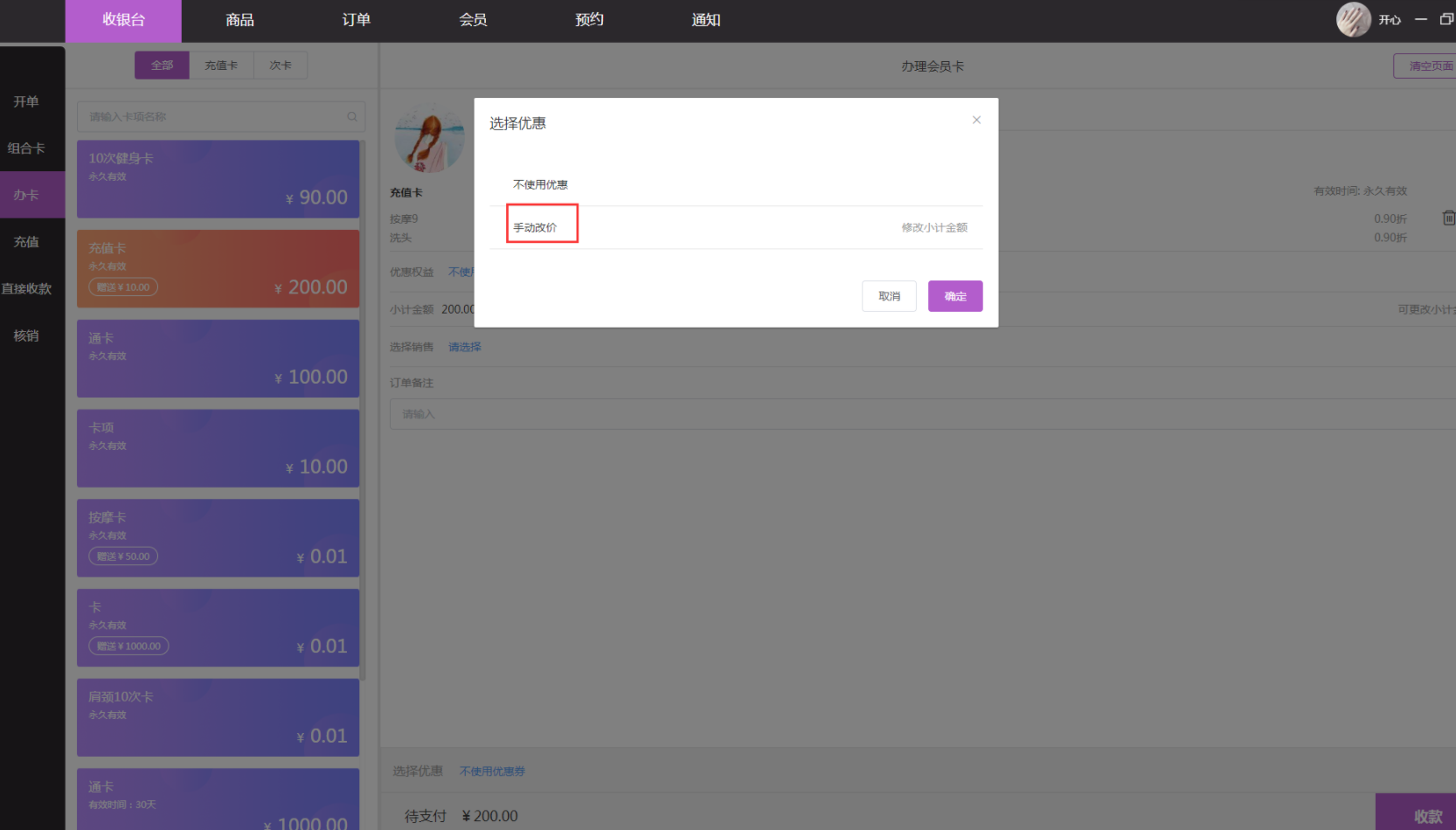 3、点击优惠权限--手动修改,可以手动修改这个张卡的价格,这张卡项涉及到销售,可以选择对应的销售员