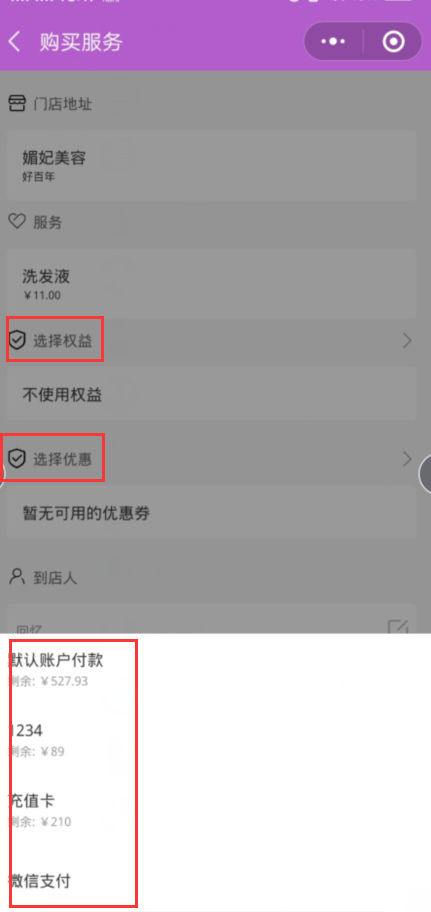 3、选择权益,优惠券,付款方式