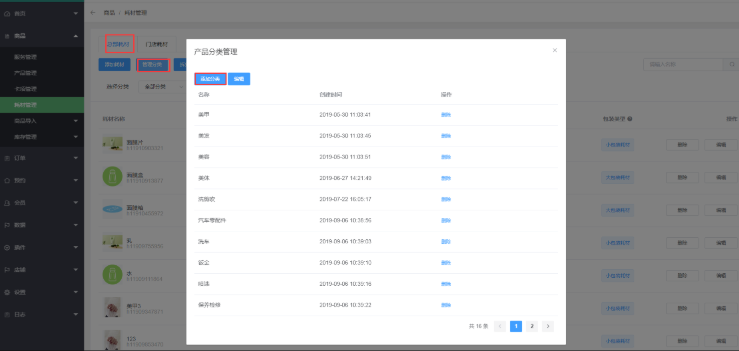 1、点添加耗材,首先,先给耗材添加分类,点击商品--耗材管理--总部耗材--管理分类--添加分类