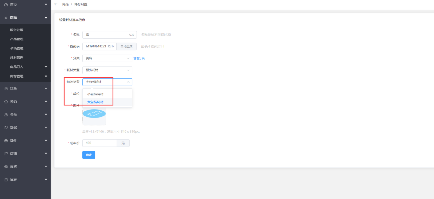 2、添加耗材。点击商品--耗材管理--总部耗材--添加耗材、 可以设置大耗材和小耗材