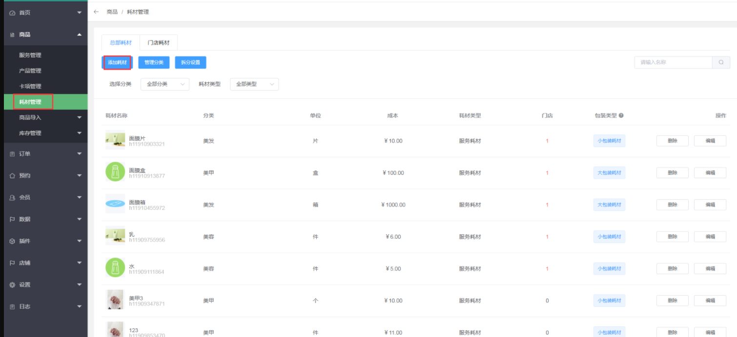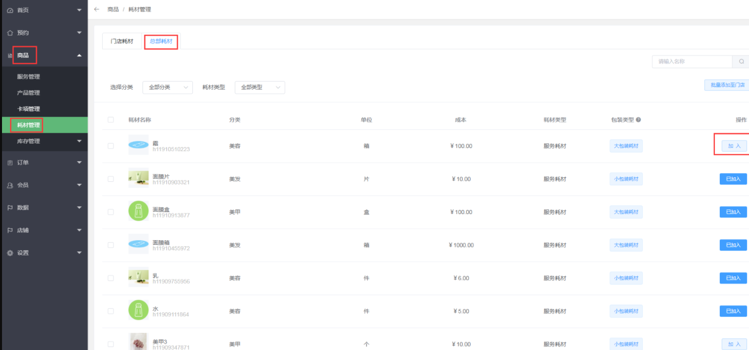 7、门店的服务想使用这项耗材,需要到门店里总店耗材手动加入到门店