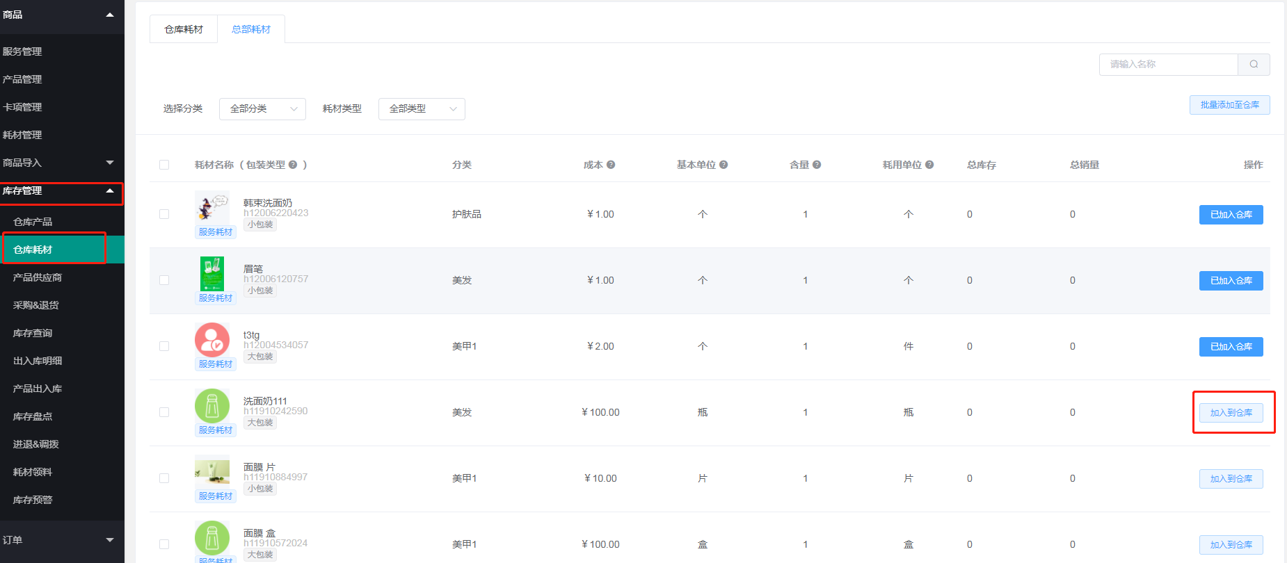 商品--耗材管理,在总店添加耗材,加入到仓库