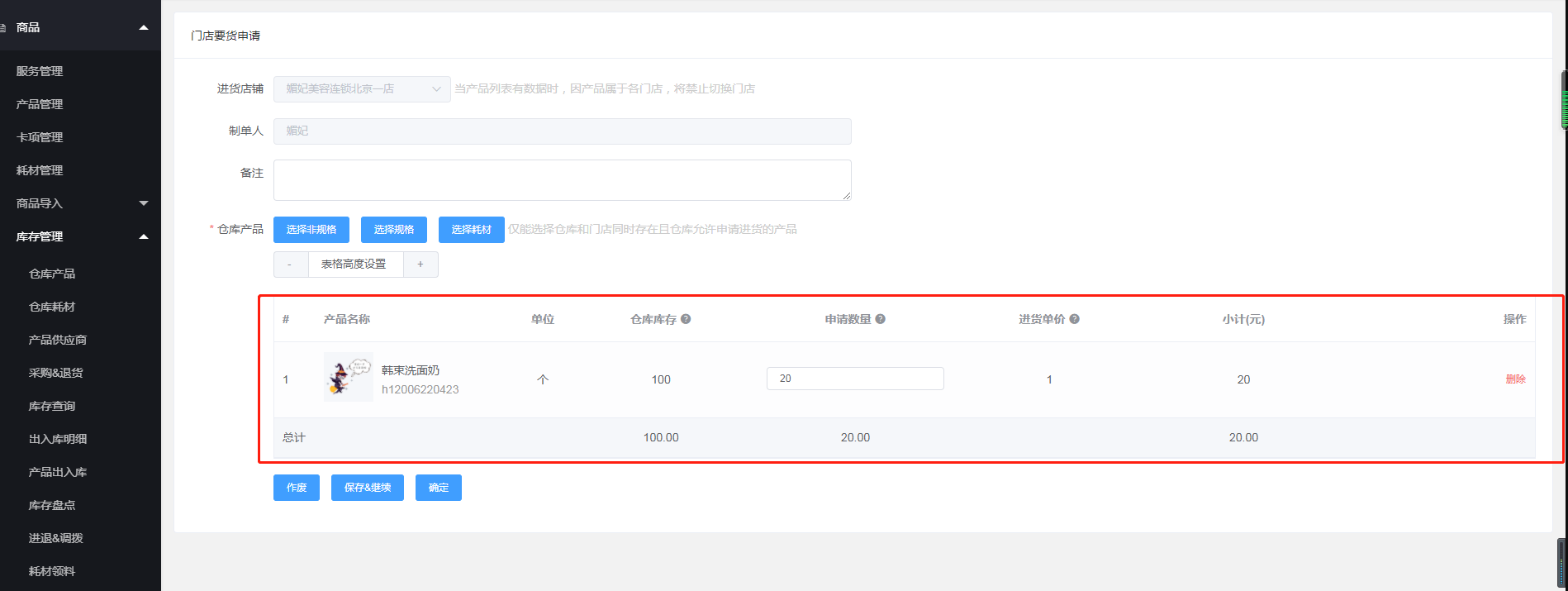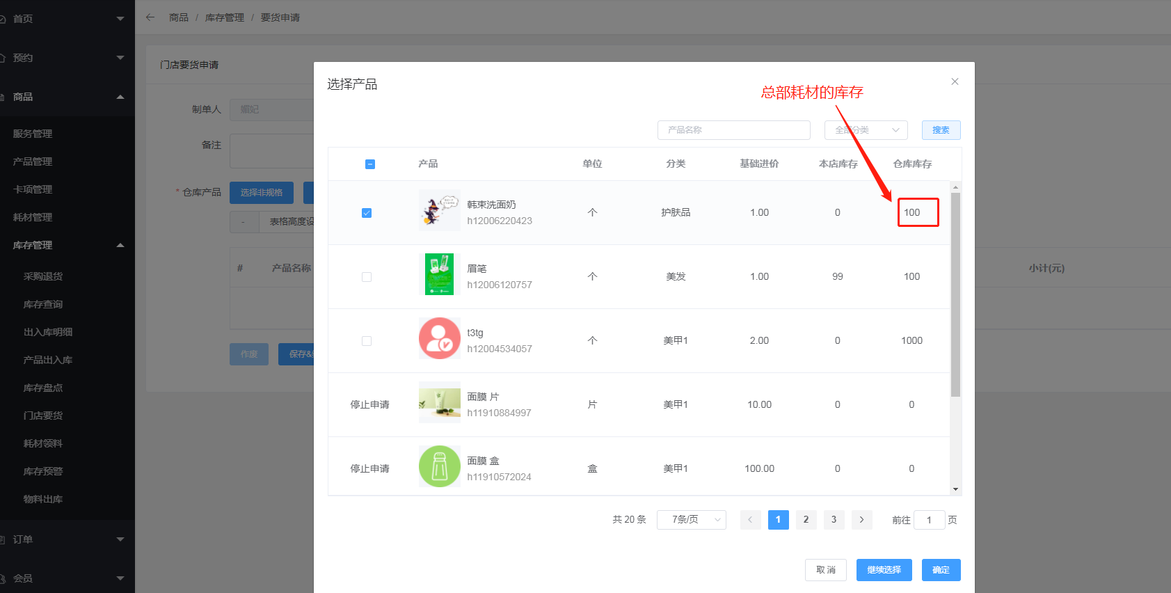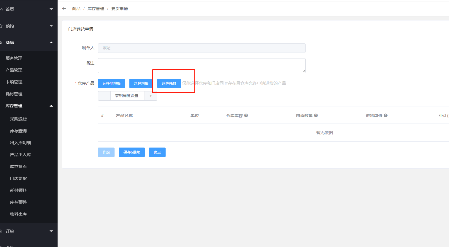 二、门店后台要想使用耗材,可以向总部要货