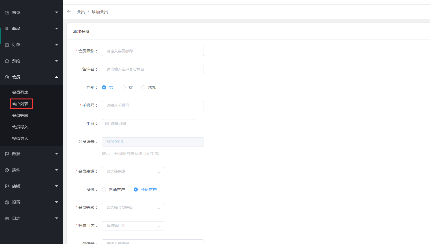 会员列表和客户列表都可添加会员,注册会员后首先成为客户列表,达到商家设置的成长值后会转换为会员列表