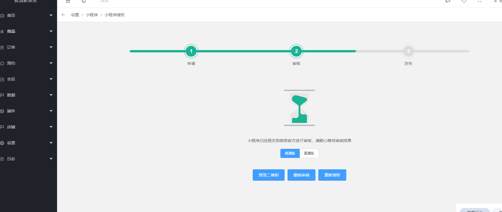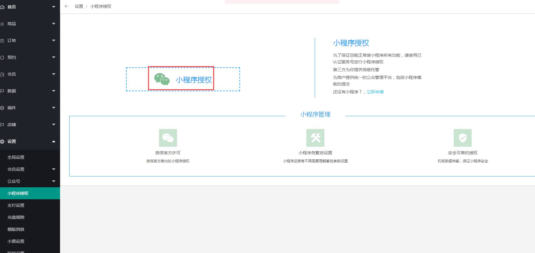 1、 点击设置---小程序授权,商家进行微信扫码授权