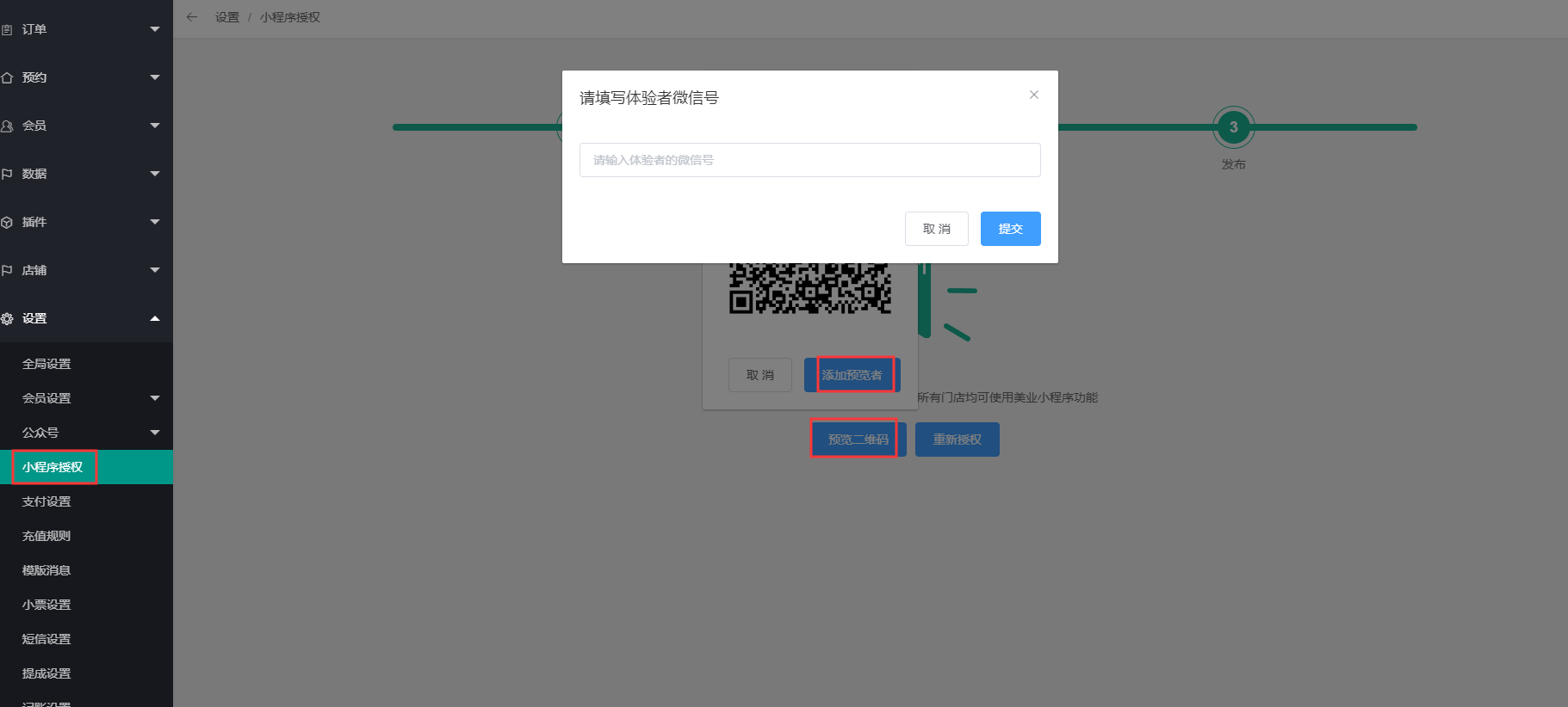 授权完,点击二维码预览,此步骤用来商家在设置小程序里面的内容,提交到微信官方审核发布前,可以进行扫码预览体验下小程序里面设置好的内容,点击添加体验者,输入体验者的微信号,绑定完成后可以进行扫码预览,进入体验版小程序