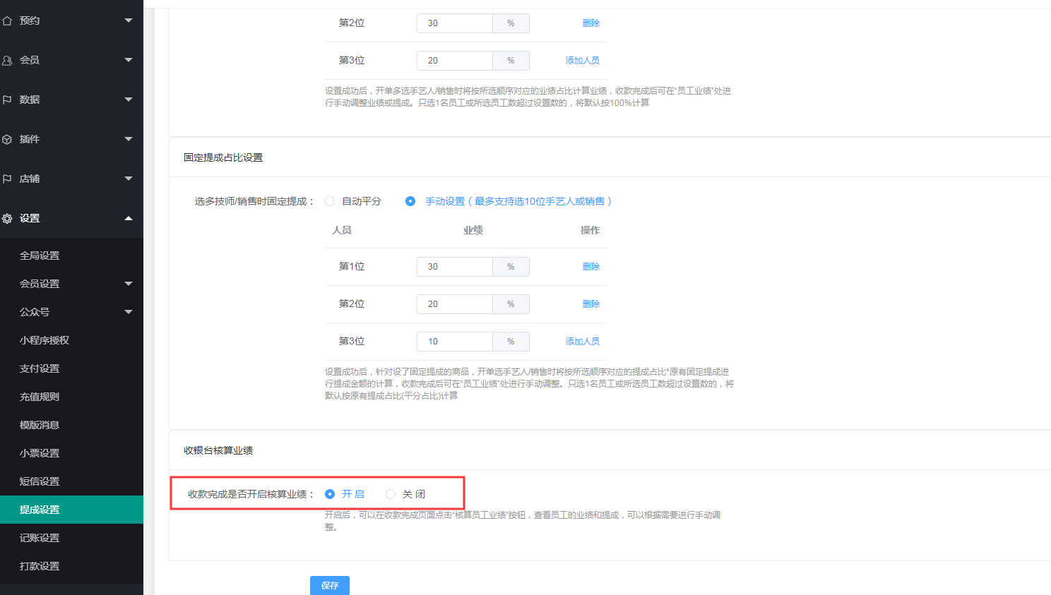 4、可以选择是否开启收款完成后的业绩核算入口