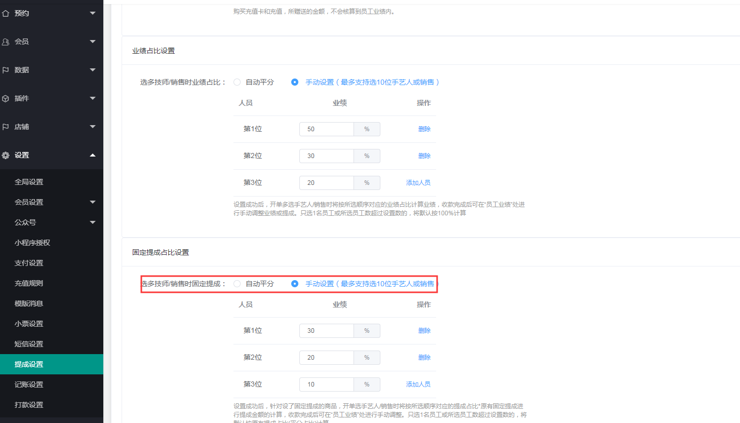 3、多选技师/销售时,根据提成类型不同,可以设置按顺序的技师/销售对应的业绩占比金额