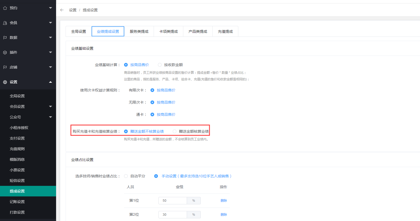 2、购买充值卡和充值核算业绩可以设置算不算员工的业绩