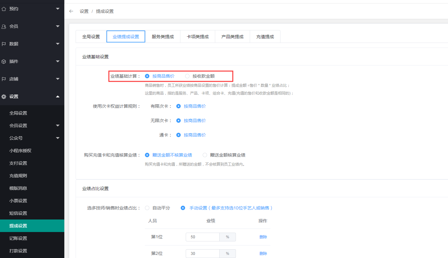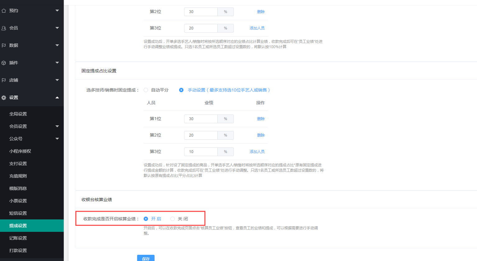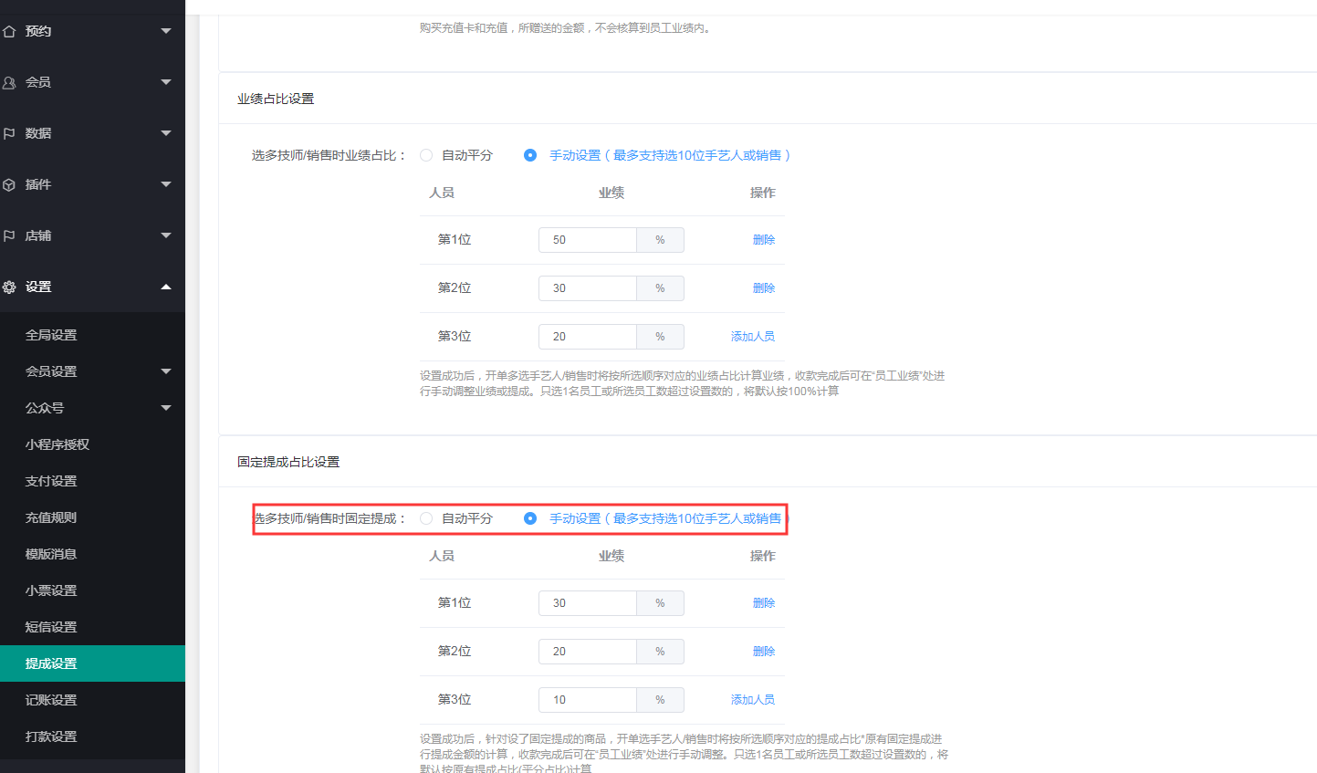 3、多选技师/销售时,根据提成类型不同,可以设置按顺序的技师/销售对应的业绩占比金额