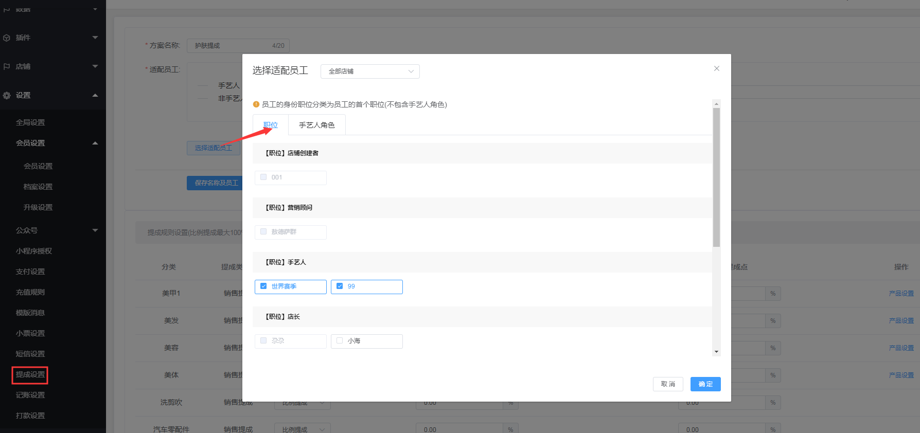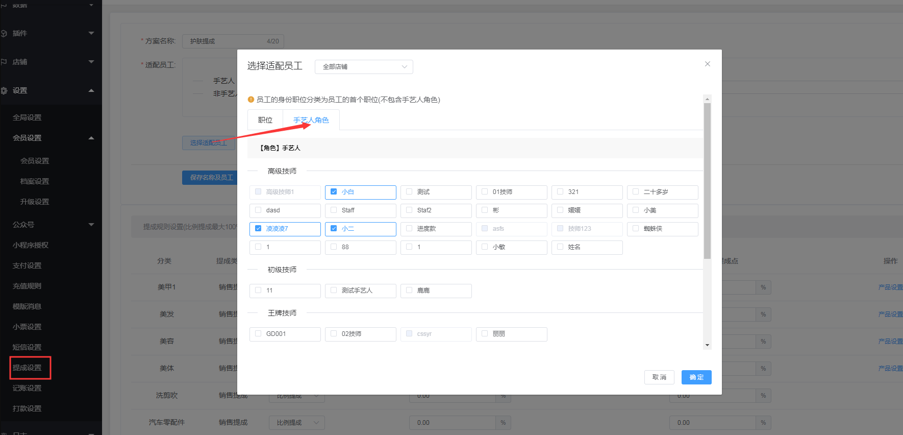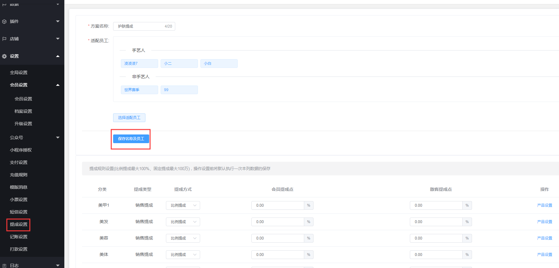 3.选择适配员工:选择该提成方案适配到的员工,开单的时候只要选了适配的员工,就会按照该方案设置的提成点来为员工算提成,注意,在产品分类下,同一个员工只能属于一个提成方案。