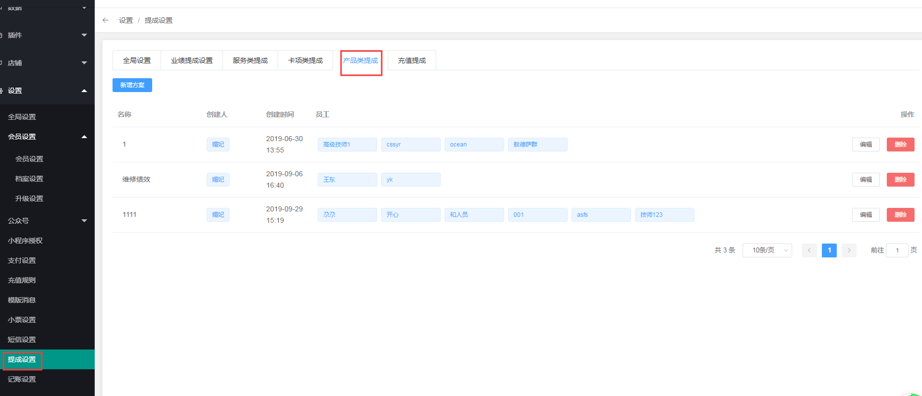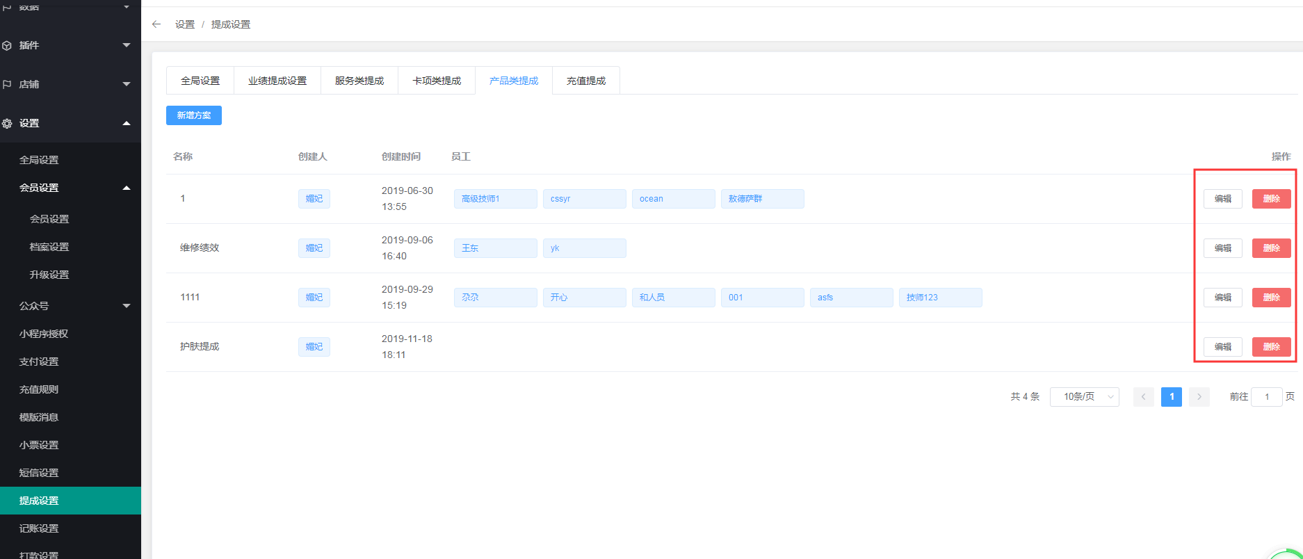 6、如果需要修改方案名称、适配员工和提成规则,或者删除方案,可以点击“编辑”按钮进行修改。