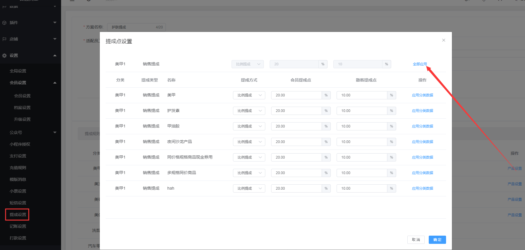 这里会展示所有产品的分类,可以针对某一种分类的产品进行提成点的统一设置,点击全部应用,也可以单独针对分类下某一个产品、甚至是产品下的规格进行单独设置