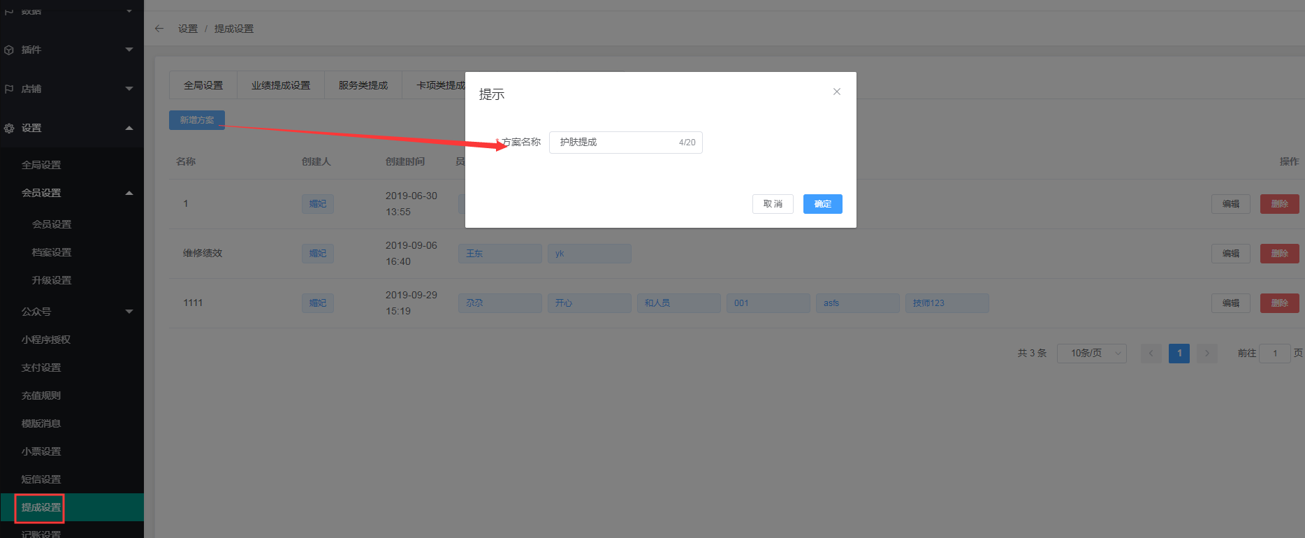 2.填写提成方案名称:设置20个字以内的名称,比如护肤提成: