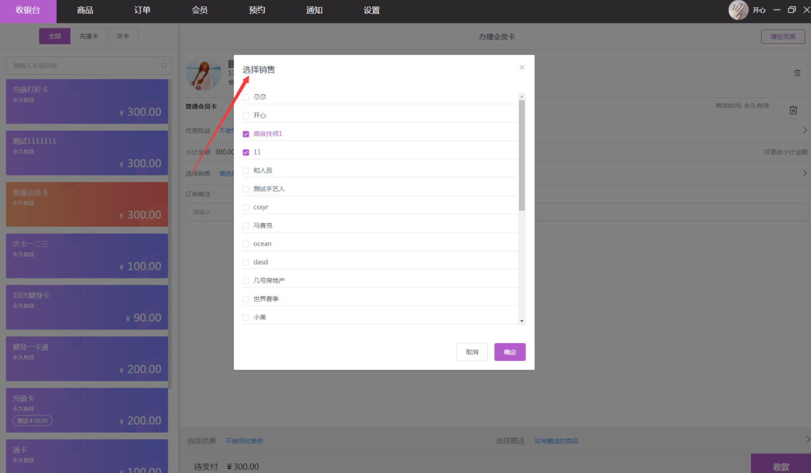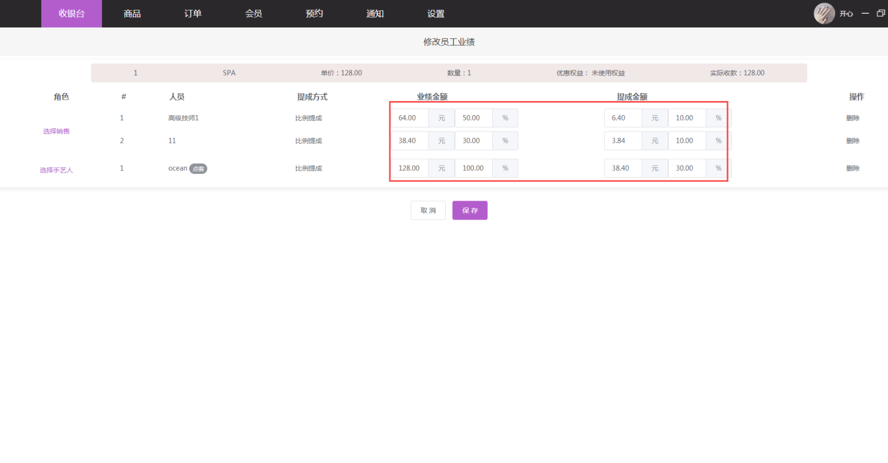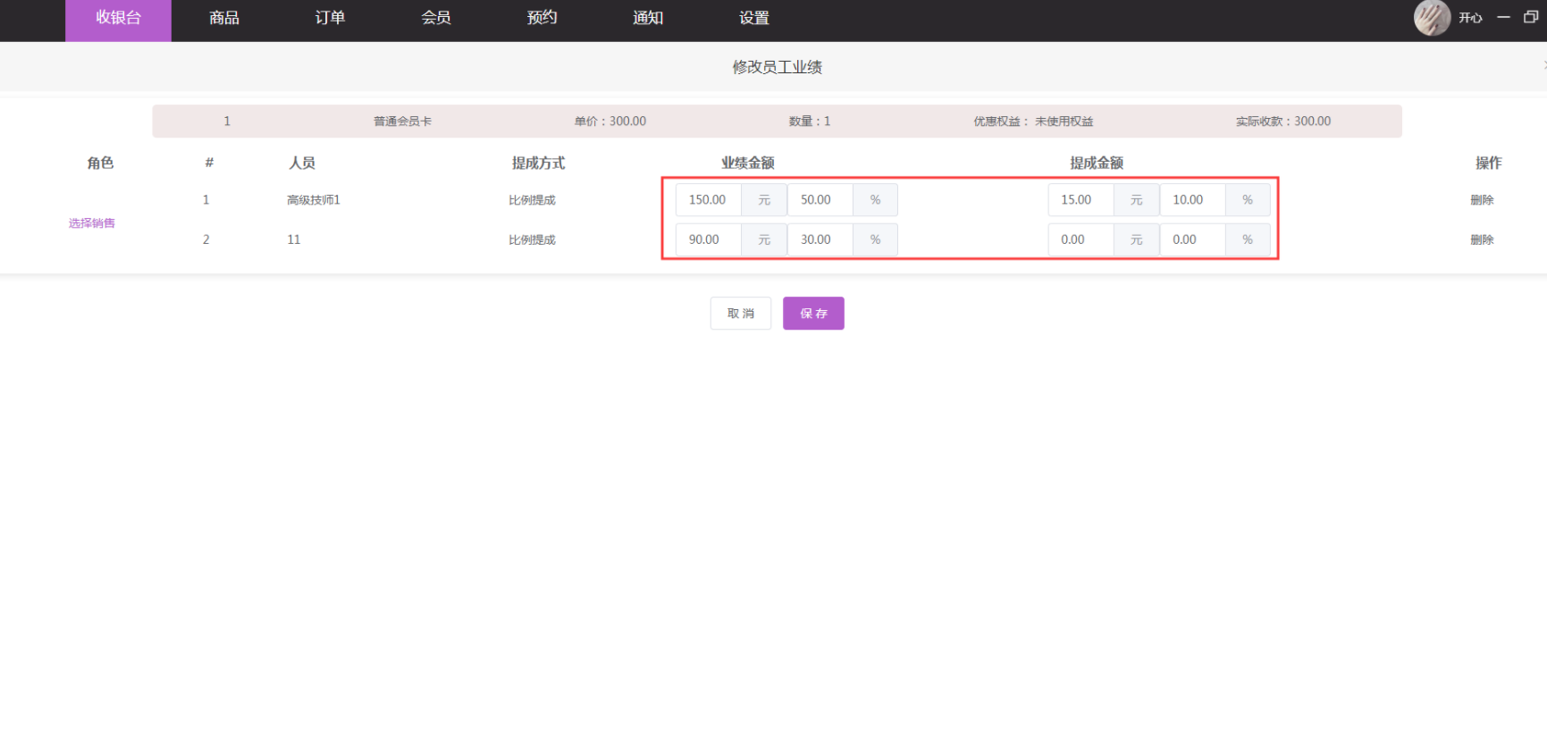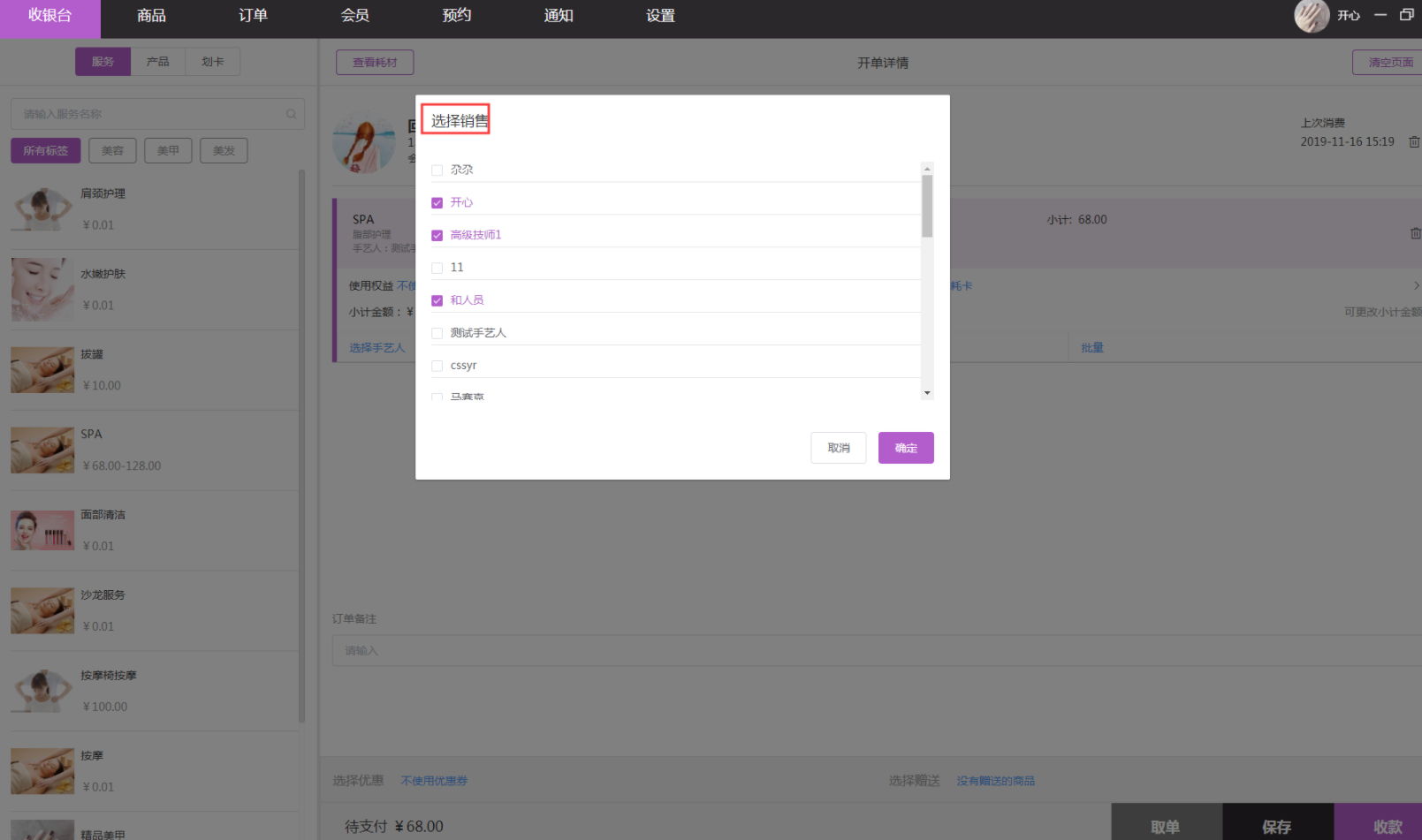 开单的时候可以选择销售,销售可以多选,最多可选10个,结算之后会按照设置好的提成方案进行业绩和提成的计算(多选的情况下会均分业绩和提成,可在收款完成之后点击“修改员工业绩”进行业绩和提成的手动调整)