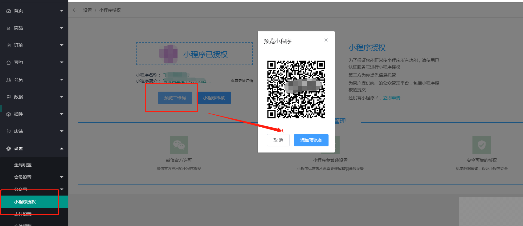 3、在设置的过程中,可以实时预览下内容,进入商户后台小程序授权那里,添加体验者进行扫码预览