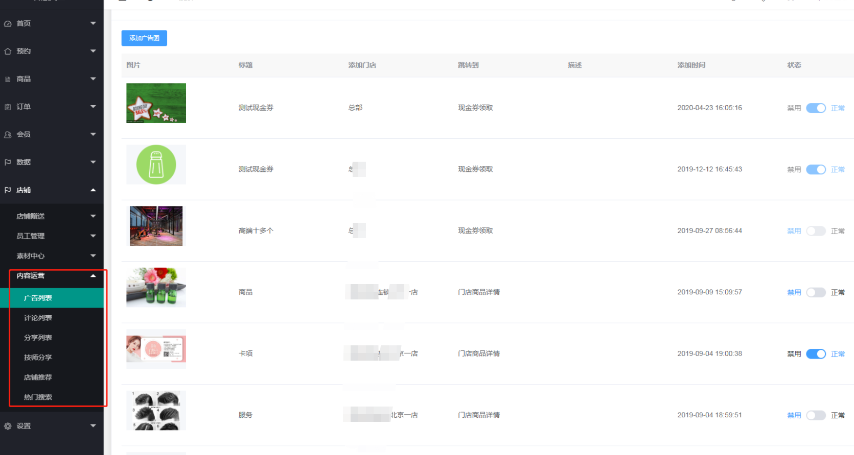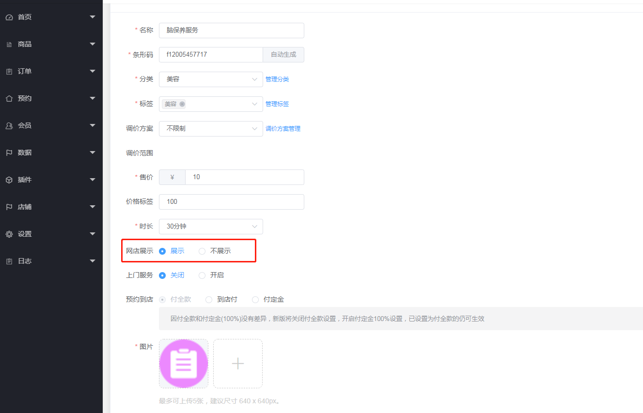 1、进入商家后台,在添加服务、产品、卡项的时候开启网店展示的按钮
