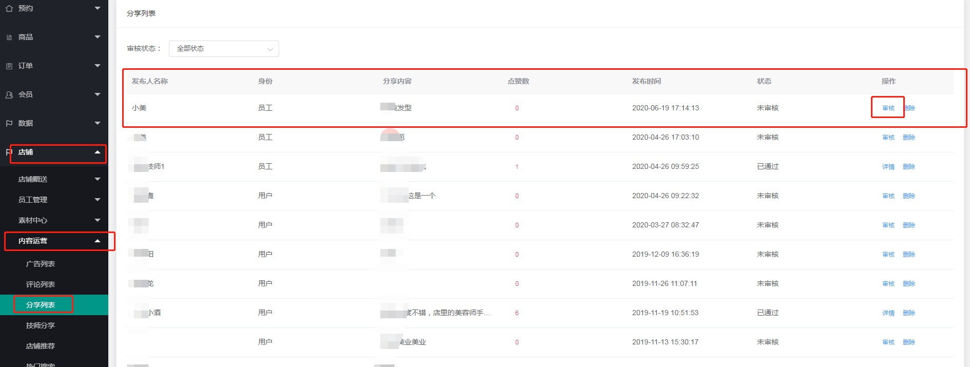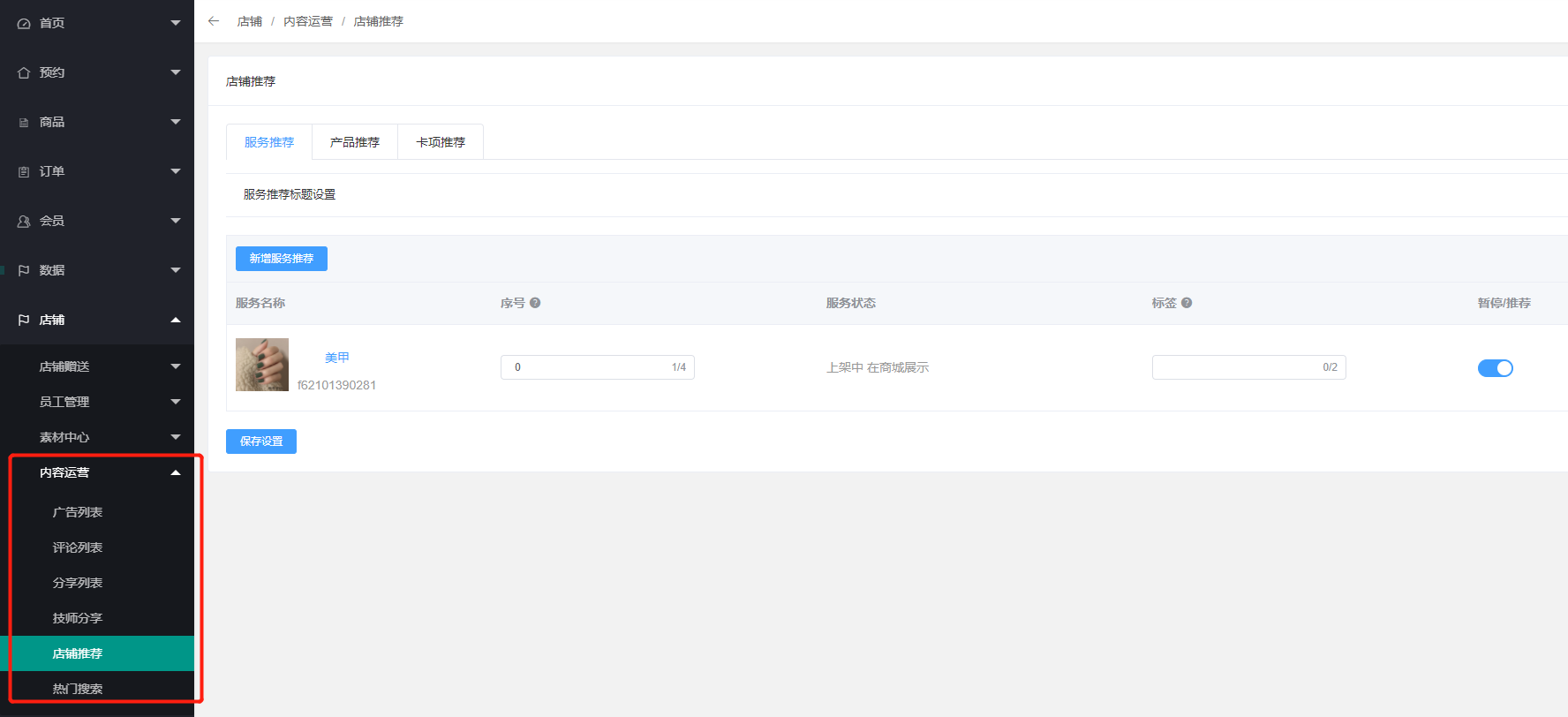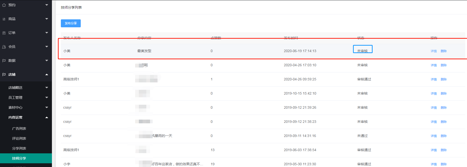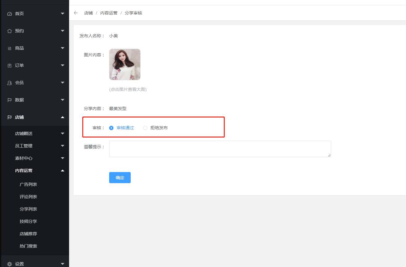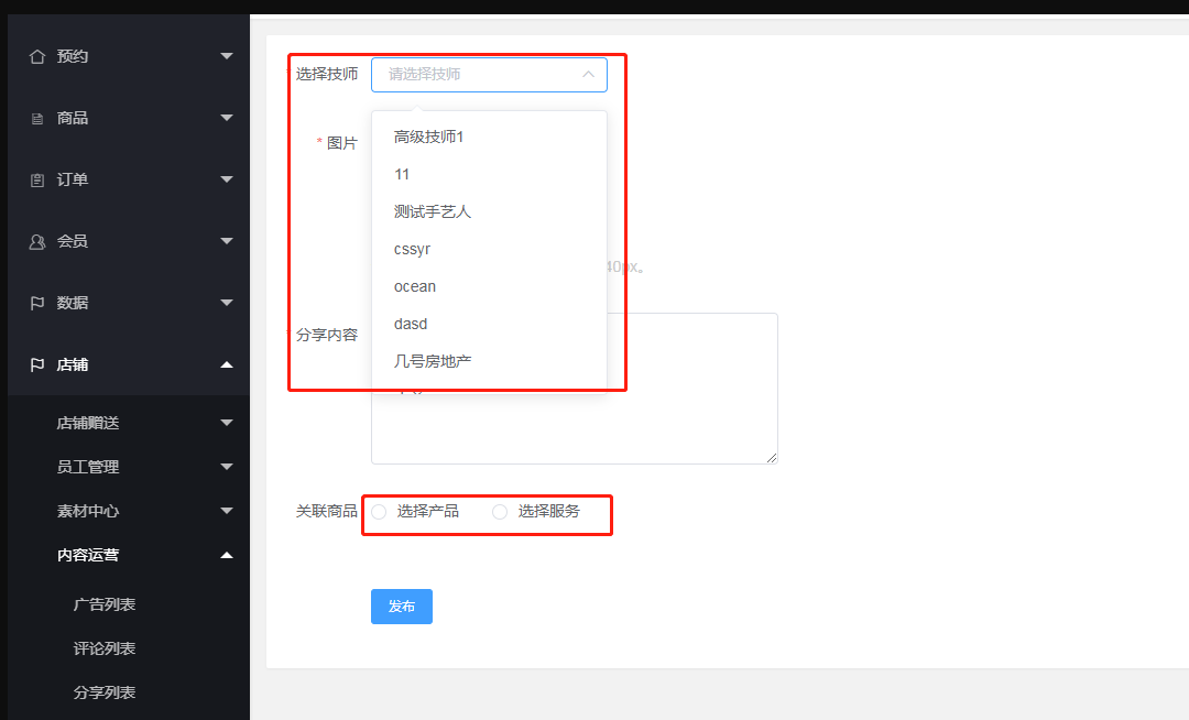 2.选择好技师、图片、内容和关联的产品或者服务,点击发布