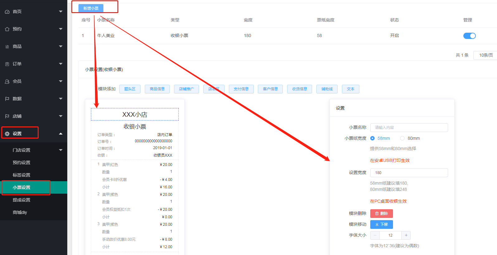 2、点击添加收银小票,选中想要设置的位置,例如选中小票名称部分,在右侧设置小票名称、纸的宽度、是否删除该模块、模块上下移动字体大小等信息都可设置,(注:如果想要设置小票上面的二维码,将按填写的内容生成二维码,建议填写网址链接)