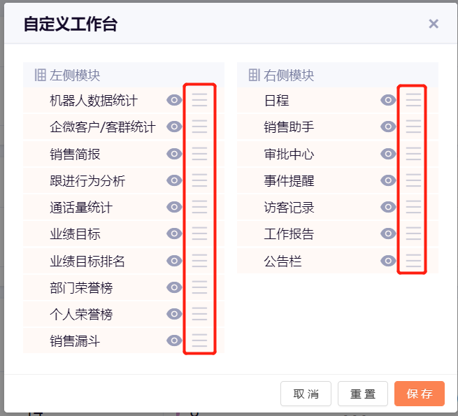 鼠标长按模块字段右侧的“拖动”按钮,可拖拽模块,调整其在工作台上的显示顺序