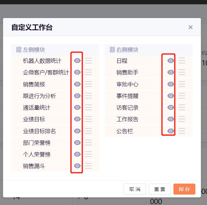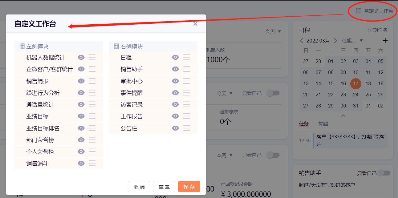 用户可以根据自己需要自定义设置开启/关闭显示工作台模块,还可自定义设置每个模块的显示顺序