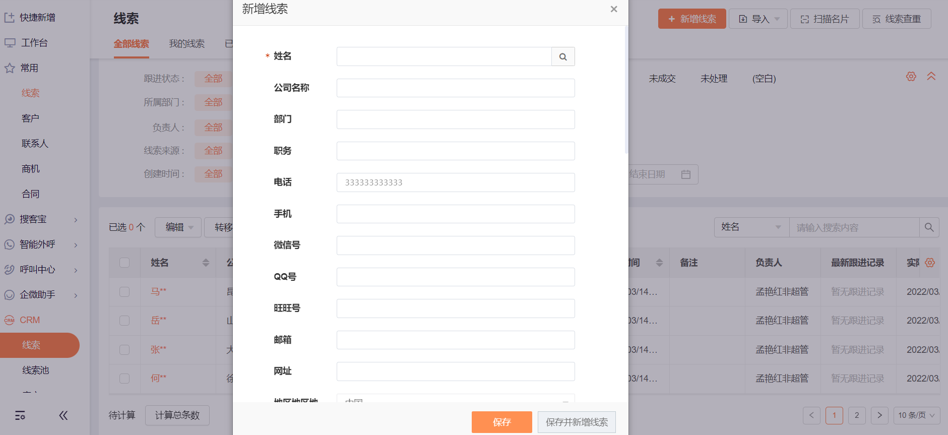 如果点击“保存”,系统会新增一个线索并刷新列表上的数据。如果点击“保存并新增线索”,则会在保存线索的同时弹出一个新的新增线索窗口,可继续新增下一个线索。