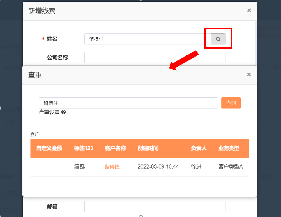 点击“姓名”旁边的搜索图标可弹出查重窗口,同时自动将“姓名”中的内容作为查重关键词: