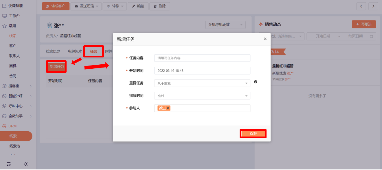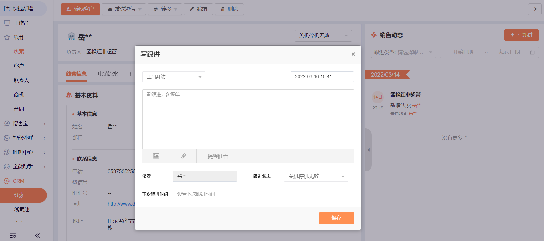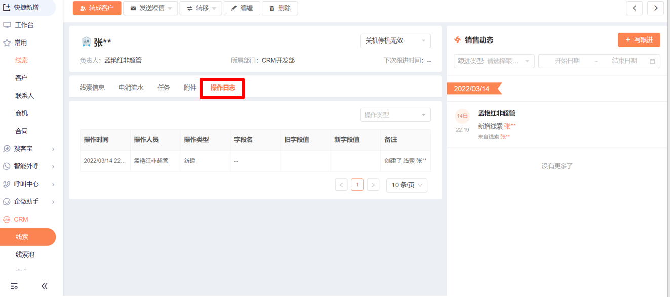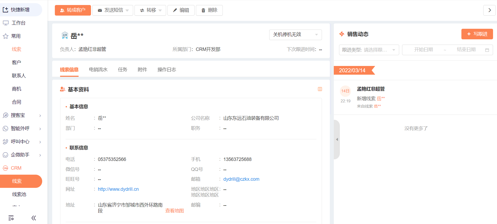 如果要对单个线索进行管理,或者查看线索的详细信息以及历史的跟进记录等,可点击线索姓名进入线索详情。在线索详情页,可以对线索进行编辑、转移、删除、转成客户、写跟进等操作,还可以查看线索相关的所有信息如线索的资料、销售动态、任务、附件、操作日志等。