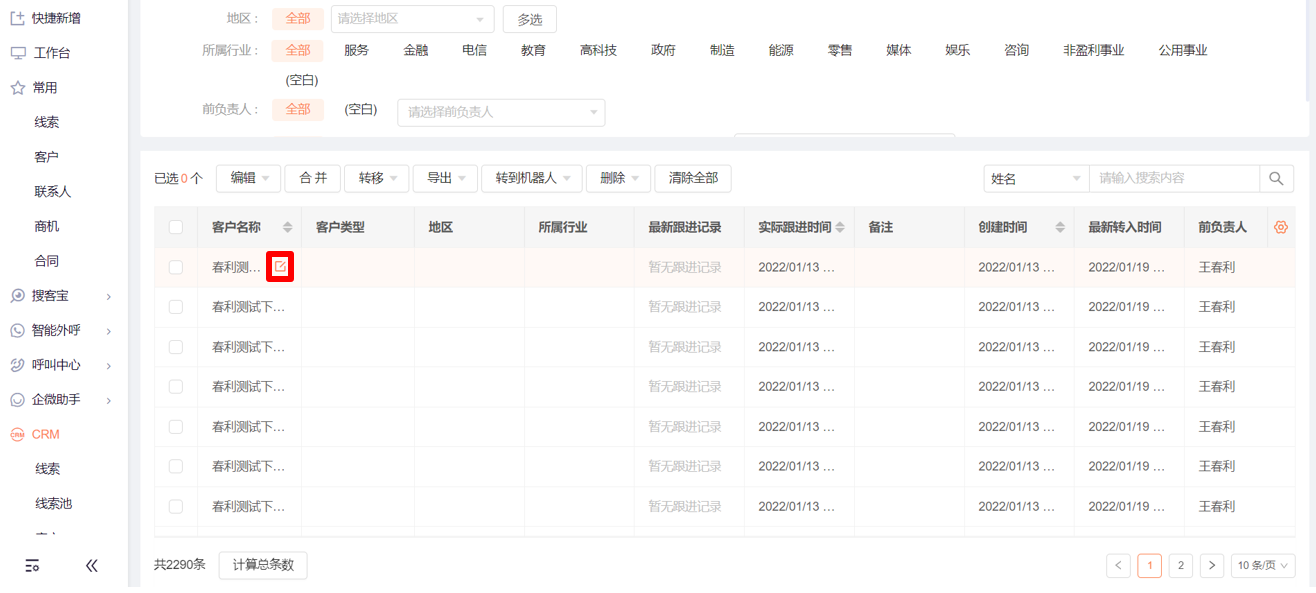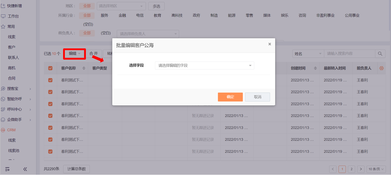 1、在公海客户列表页,将鼠标移动至需要编辑的字段的后方,会显示快捷编辑的按钮,点击后可快速编辑这个字段,修改完成后鼠标点击其他区域将自动保存。2、在公海客户列表页,勾选多个公海客户后,点击编辑按钮,可批量编辑(目前支持单选、时间类型的字段)。