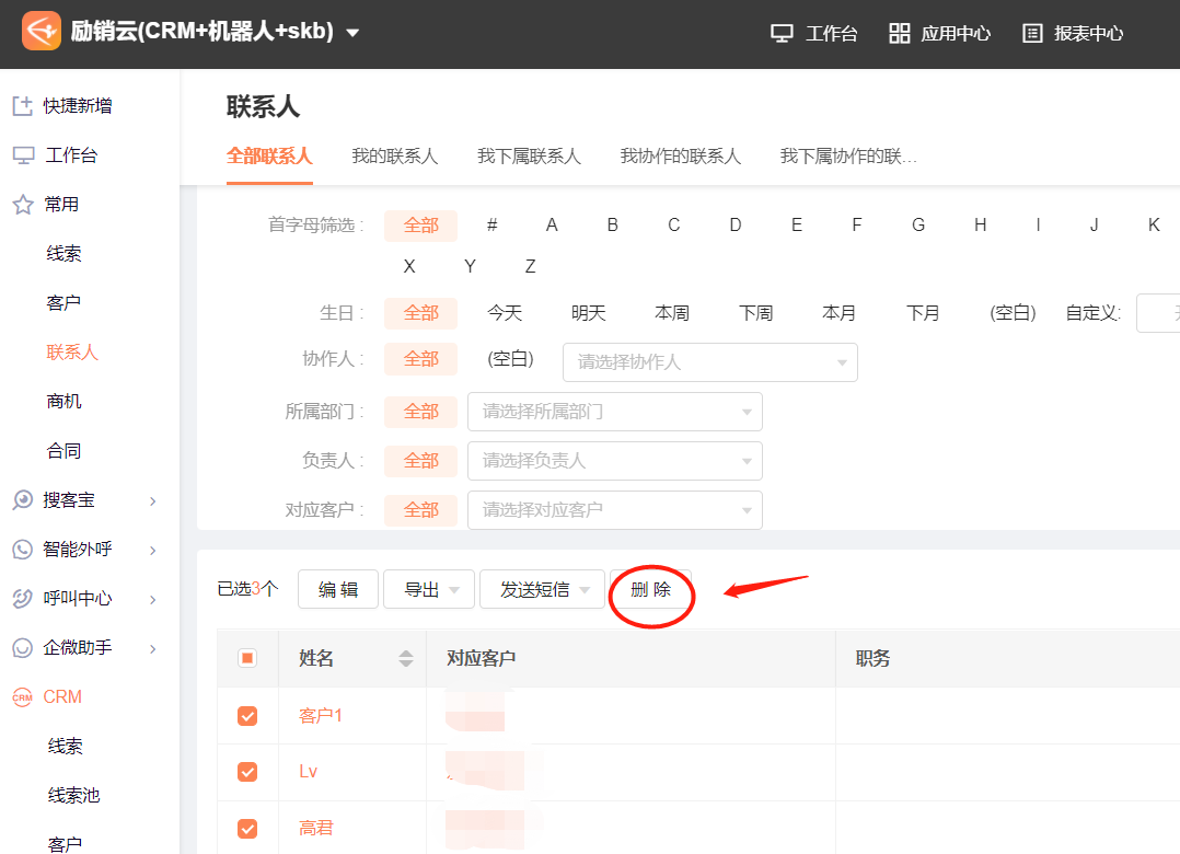 当某些联系人数据不再被需要时,可在联系人列表勾选多个联系人,进行批量删除: