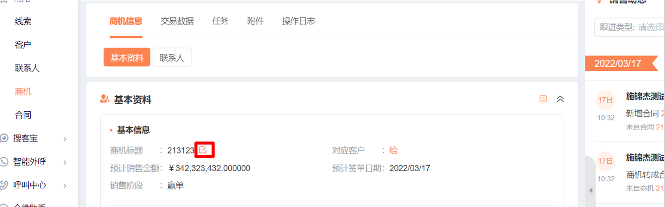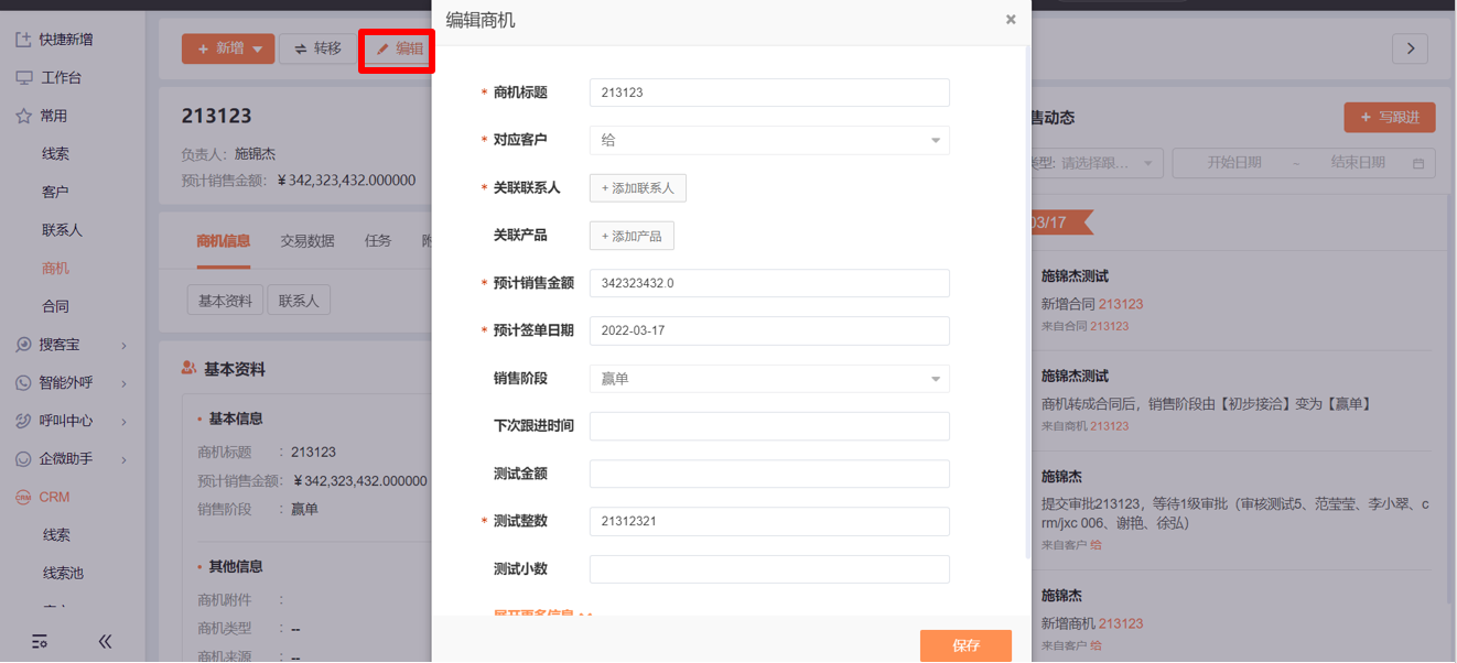 1、进入商机详情页面,点击编辑按钮进入编辑页面,完成编辑后保存数据。2、在商机列表或者详情页面,将鼠标移动至需要编辑的字段的后方,会显示快捷编辑的按钮,点击后可快速编辑这个字段,修改完成后鼠标点击其他区域将自动保存。