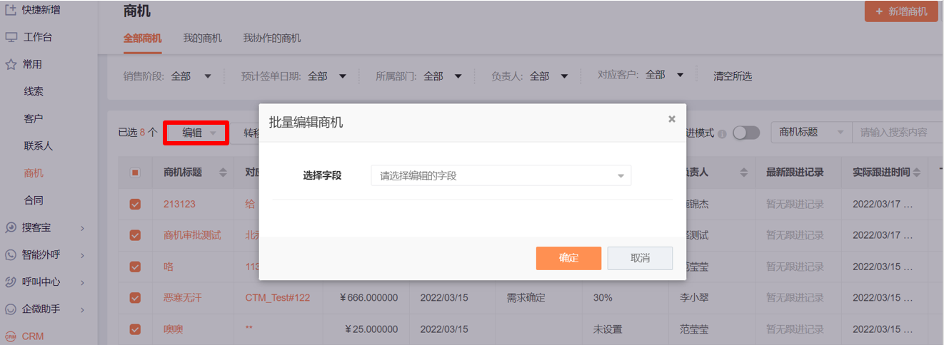 3、在商机列表页面,勾选多个商机后,点击编辑按钮,可批量编辑(目前支持单选、时间类型的字段)。