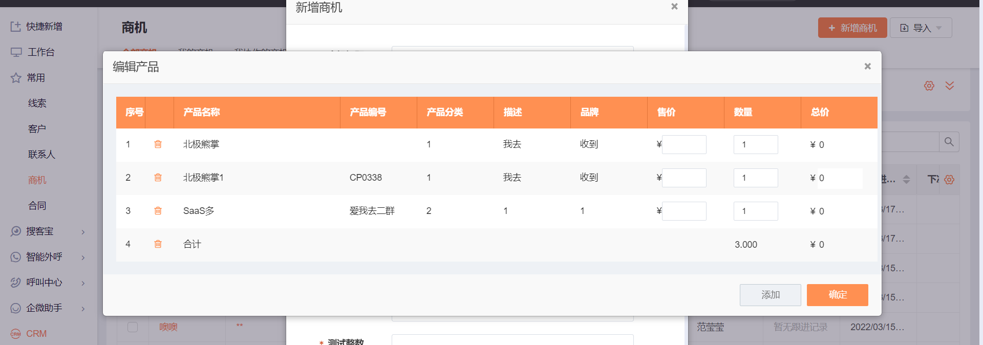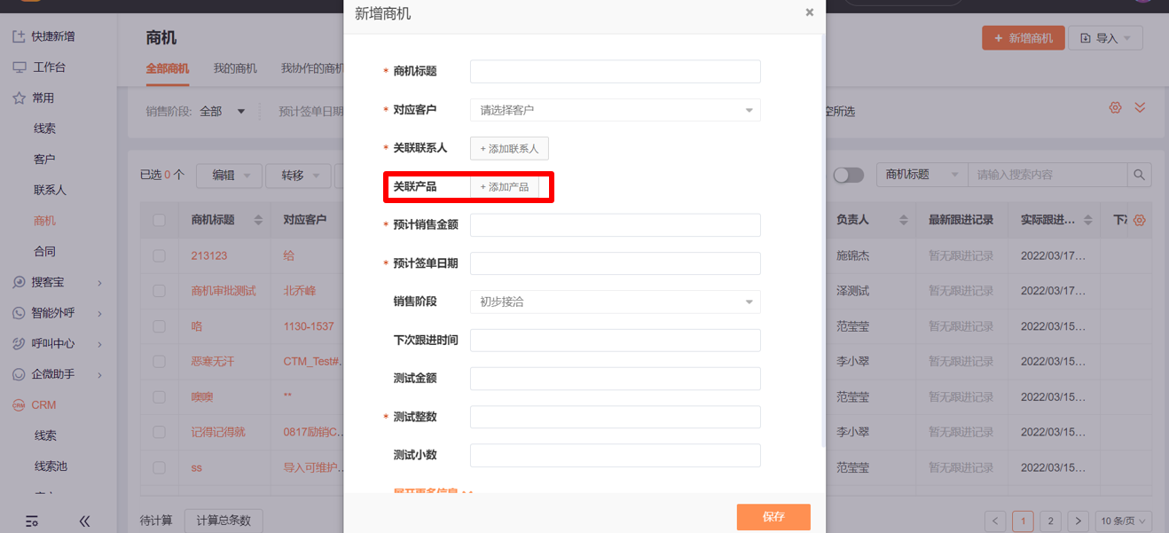 在新增、编辑商机时,启用“关联产品”字段的情况下,可点击“关联产品”按钮关联公司内已添加的产品。