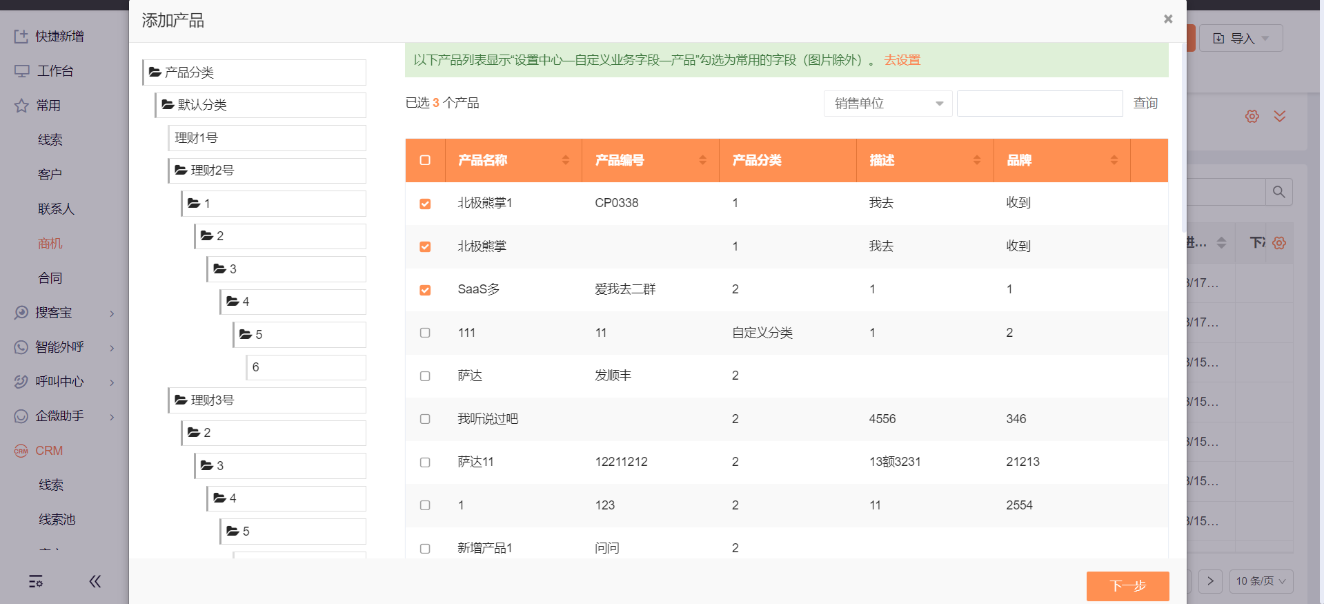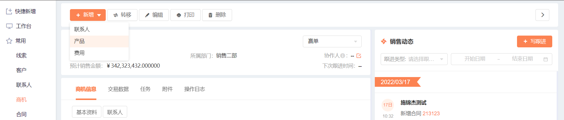 在商机详情页,点击“新增”—“产品”按钮,也可将产品关联至该商机下。关联产品分为两步: