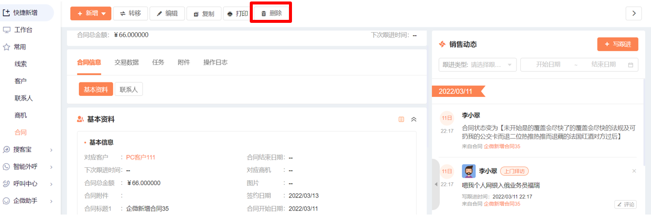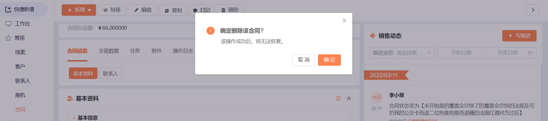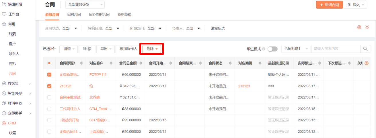 当你不需要某些合同的时候,可在合同列表勾选多个合同后批量删除:也可进入合同详情页单个删除:为避免误操作,删除时需要确认,确认后系统才会删除。