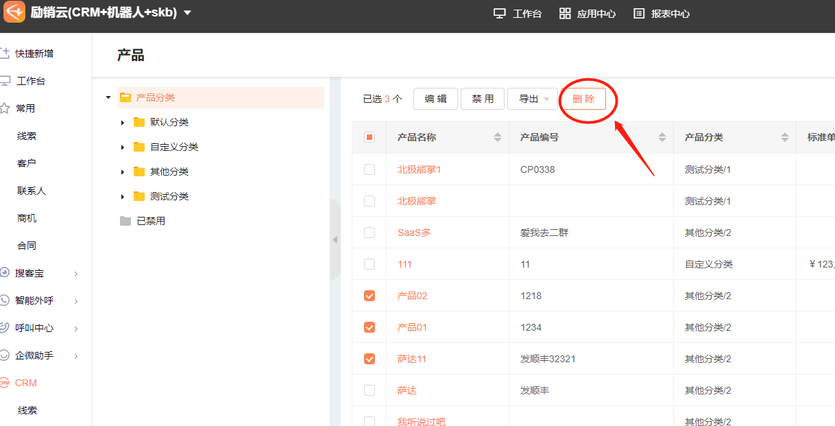 2、在产品列表页,勾选若干产品后,点击“删除”按钮,可完成批量删除。