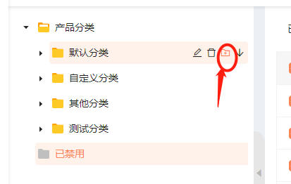 鼠标移至产品分类上,点击产品分类右侧“+”按钮,在弹出窗口中填写新的产品分类名称后,点击确认,完成新增操作。