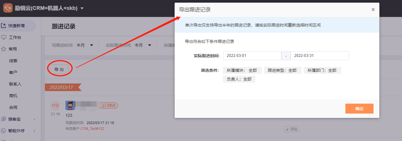 在【跟进记录】模块,点击“导出”按钮,选择写跟进时间(实际跟进时间)区间范围,可将筛选后的跟进记录统一导出到Excel表格中。