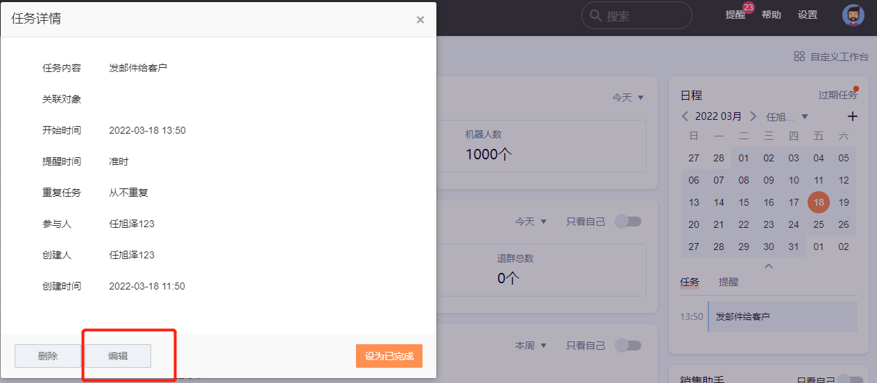 工作台任务列表中的任务支持编辑,用户选择需要修改的任务,在弹窗中点击“编辑”,即可修改任务内容。