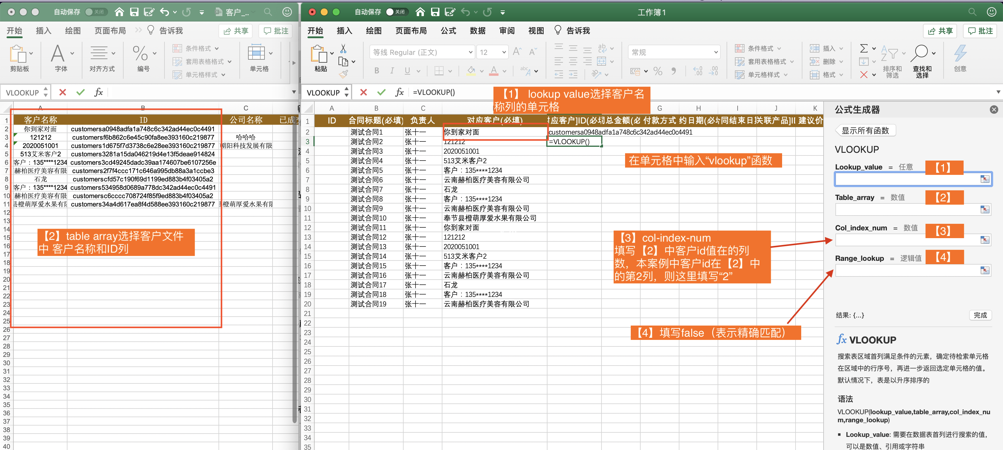 **「table array」**:需要从哪个范围内去取数据匹配,本案例中,是需要在有客户id和名称的文件中取客户id字段,那么这里就需要框选文件中客户名称和id2列的范围;