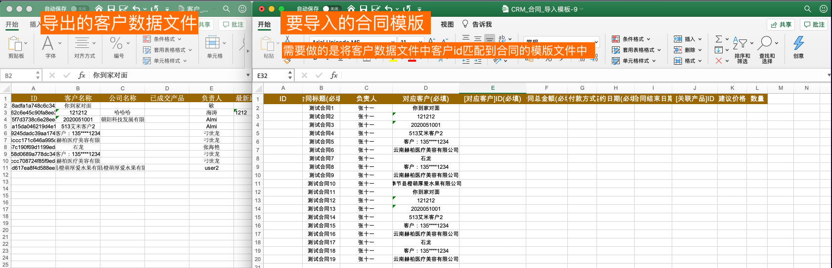 首先准备需要用到的数据文件,我们以导入合同关联客户数据为例。准备有客户id和客户名称的数据文件,然后是导入的合同文件。