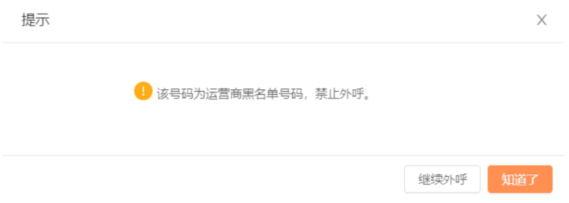 2)如选择“继续外呼”,则外呼限制弹窗中会增加“继续外呼”按钮,点击后可以跳过黑名单过滤规则继续外呼。