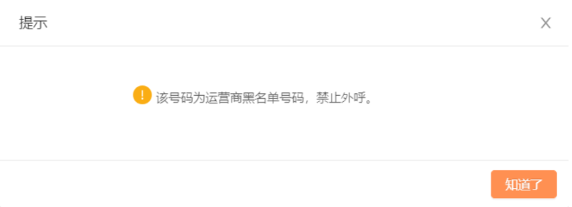 1)默认选中第一个“禁止外呼”,则出现外呼限制弹窗后,弹窗只有一个“知道了”按钮,只能跳过拨打下一个;
