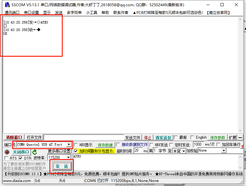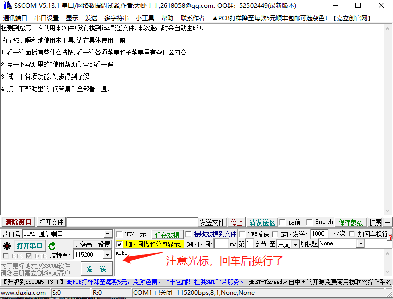 #### 3. 在文本框输入ATE0加上回车,**0是零**