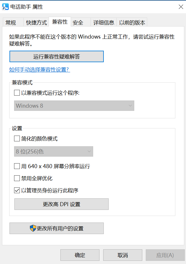 电话助手会自动设置为以管理员方式运行,若设置失败,则需手动在电话助手的右键属相菜单中,勾选【以管理员身份运行此程序】,以防出现未知问题。