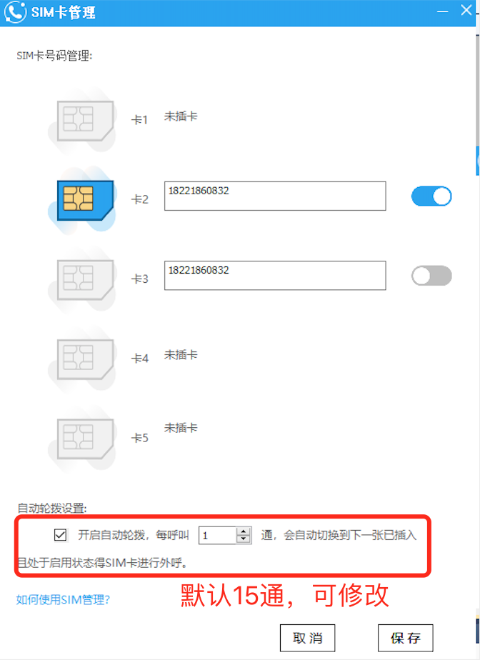 建议插入2张以上的SIM卡,两张卡的轮拨间隔次数不要设置的太大,推荐使用默认设置的15通。