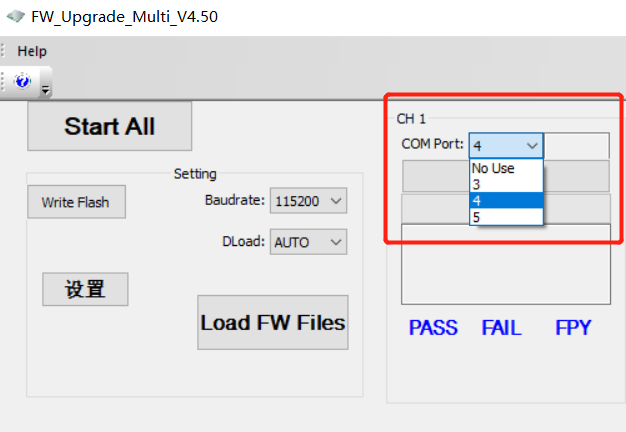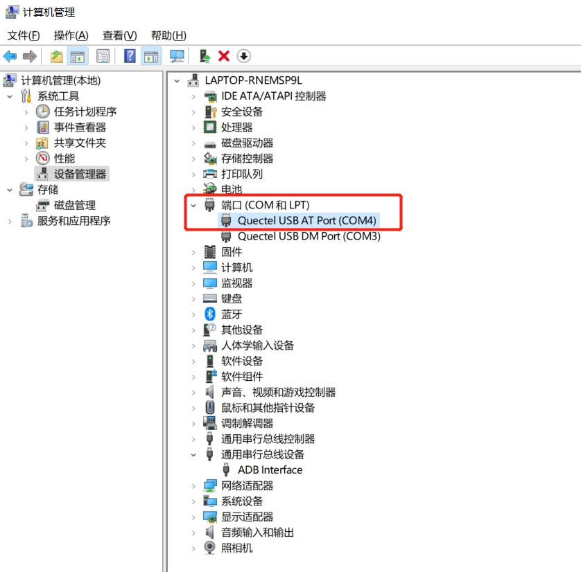 确认五卡话机已成功连接电脑,打开设备管理器,展开端口,查看 **Quectel USB AT Port**端口,查看括号内COM后的数字,切换到 FW\_Upgrade 软件,CH1 选择对应的数字端口。(下图举例为4,不同电脑可能不一样,以COM后实际数字为准)