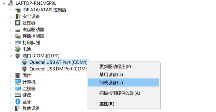 第4步的2个Quectel端口,依次右键点击卸载设备,并在弹窗中勾选删除选项后,点击卸载按钮等待完成即可。(需要将安装的升级驱动卸载后才能正常使用。)